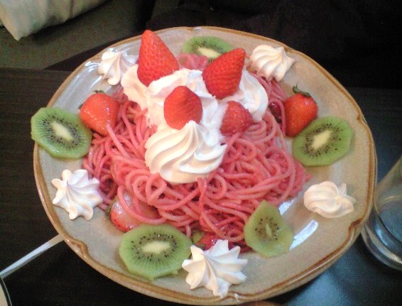 まずは【甘口いちごスパ】…もう見た目からしてパスタの範疇を越えていることが分かる。