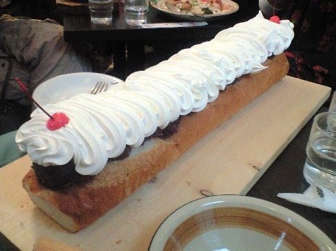 長さおよそ40cm超のフランスパンの上に小倉餡、生クリームをドンと盛ってある…まあ、見た通りの品である。
